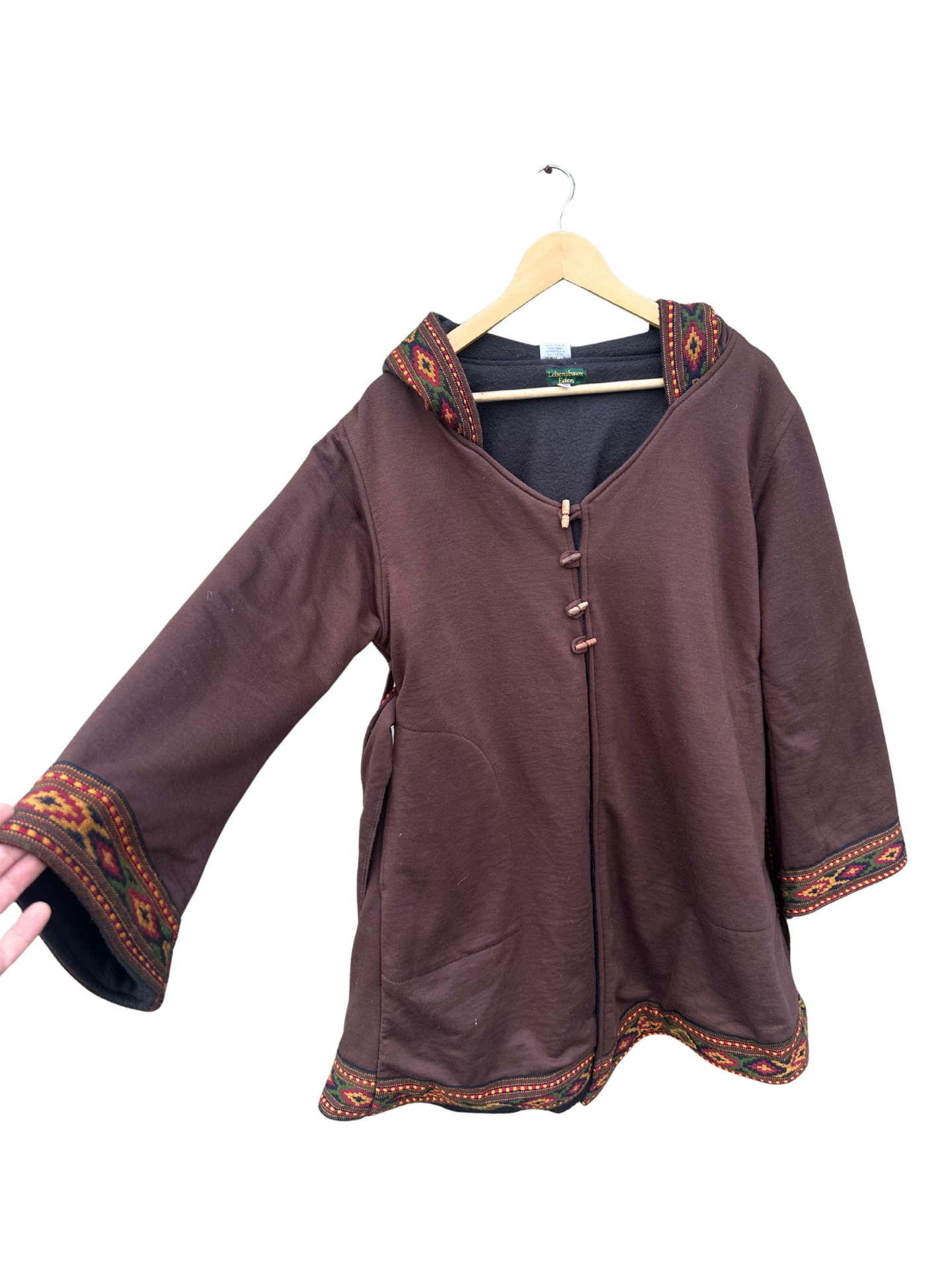 Ein robuster und bequemer Mantel aus Sweat-Baumwolle mit wunderschöner Borte, innen angeraut, mit Taschen und Kapuze. Baumwoll-Polyester-Mischgewebe kombiniert die Weichheit und Atmungsaktivität der Baumwolle mit der Strapazierfähigkeit und pflegeleichtigkeit von Polyester, dadurch Superwarm und bequem.